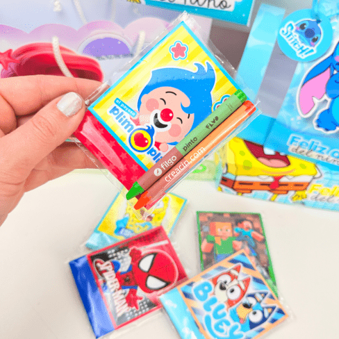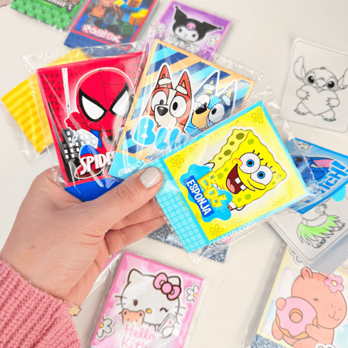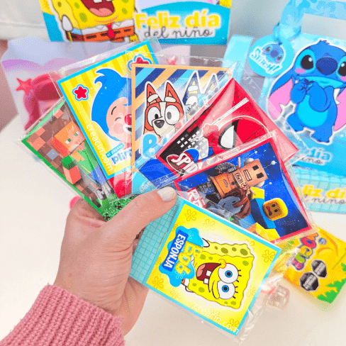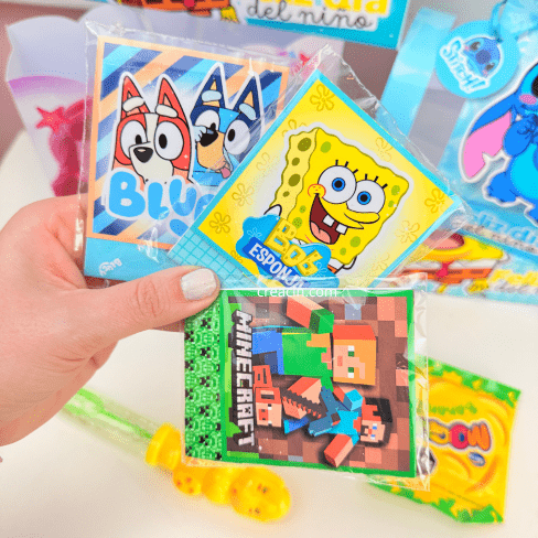 - INCLUYE 13 PERSONAJES INFANTILES; STICH, HELLO KITTY, BOB ESPONJA, CAPIBARA, ROBLOX, BLUEY, SPIDERMAN, MINECRAFT, UNICORNIO, LABUBU, KUROMI, UNICORNIO Y PLIM PLIM.